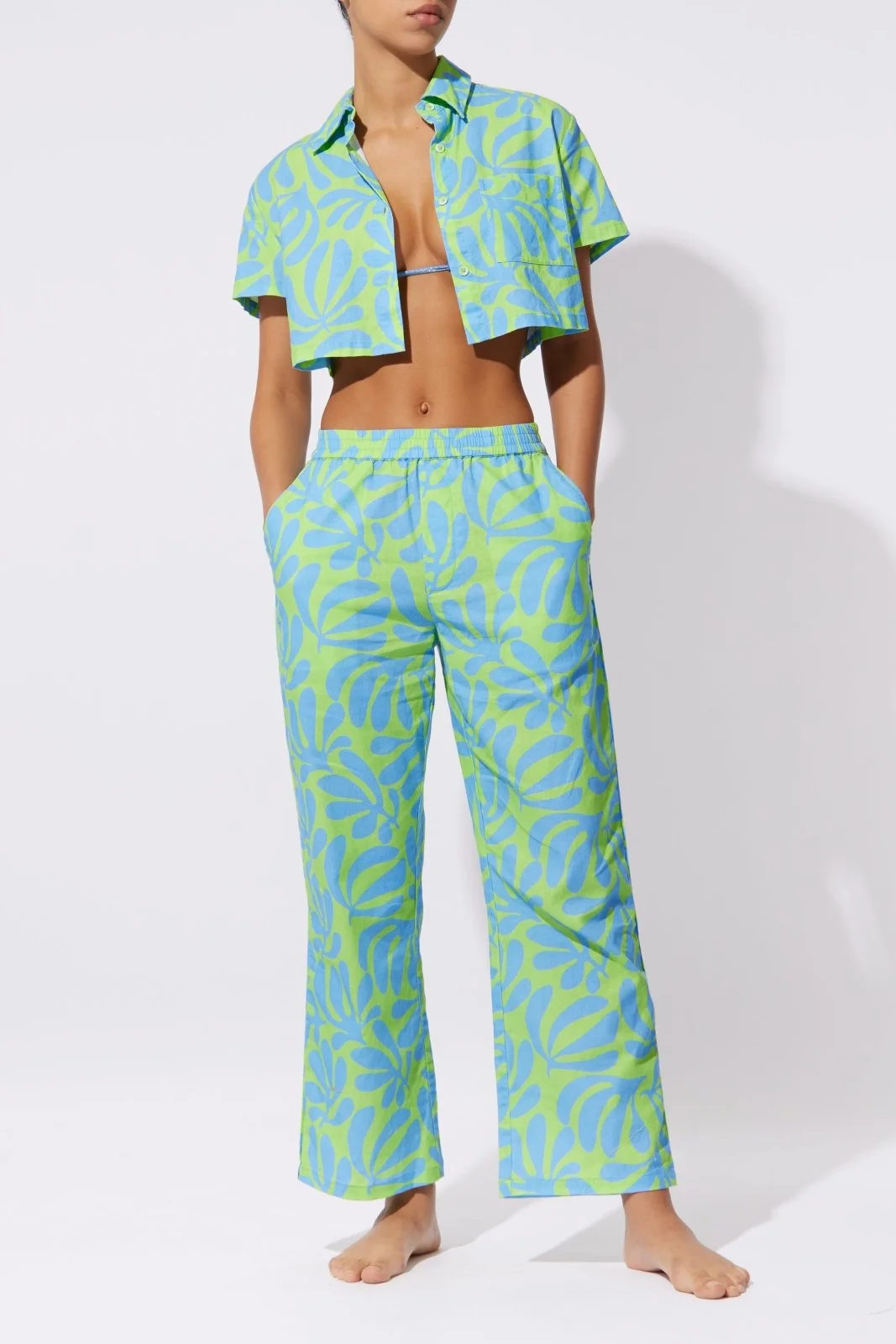 Standout in the vibrant leaf print Avril Pant. Featured in a soft cotton; this comfortable straight leg pant is a Spring staple. Functional pockets and and elastic waistline, pair with the coordinating Cropped Cabana for a chic coverup or everyday set.