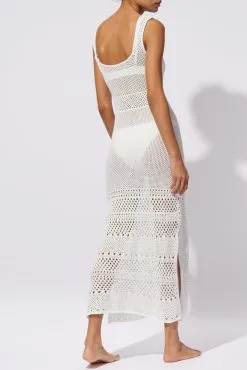 Comfortable and chic, the new Kimberly Dress features intricate crocheted designs throughout the figure hugging silhouette. Style over your favorite suit or pair over a nude slip to wear day to night. Designed with side slits for optimal movement.ย